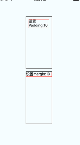 <View style={styles.container}> <View style={{width:100,height:200,borderColor:'black',borderWidth:1}}> <Text style={{padding:10,borderColor:'red',borderWidth:1}}>设置Padding:10 </Text> </View> <View style={{width:100,height:200,borderColor:'black',borderWidth:1}}> <Text style={{margin:10,borderColor:'red',borderWidth:1}}>设置margin:10 </Text> </View> </View>